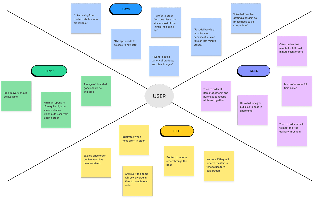 Our personas and user stories were based on an ambitious, young female who ran her own business baking cakes from home. As she receives a variety of requests from her customers and often at short notice, she wants to be able to place orders with a company that offers quick turnaround times to avoid turning away custom.