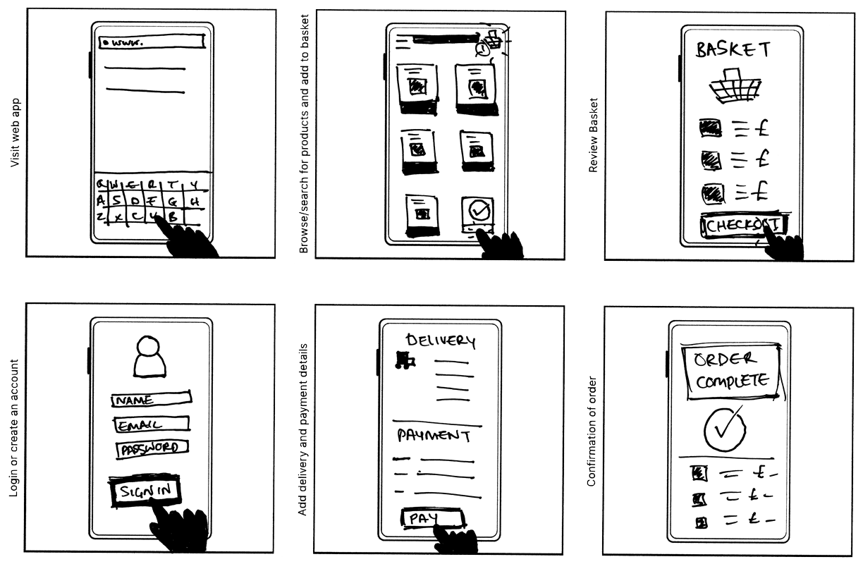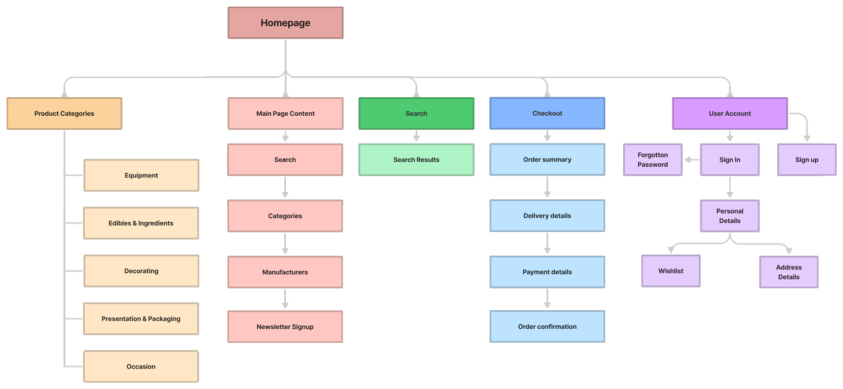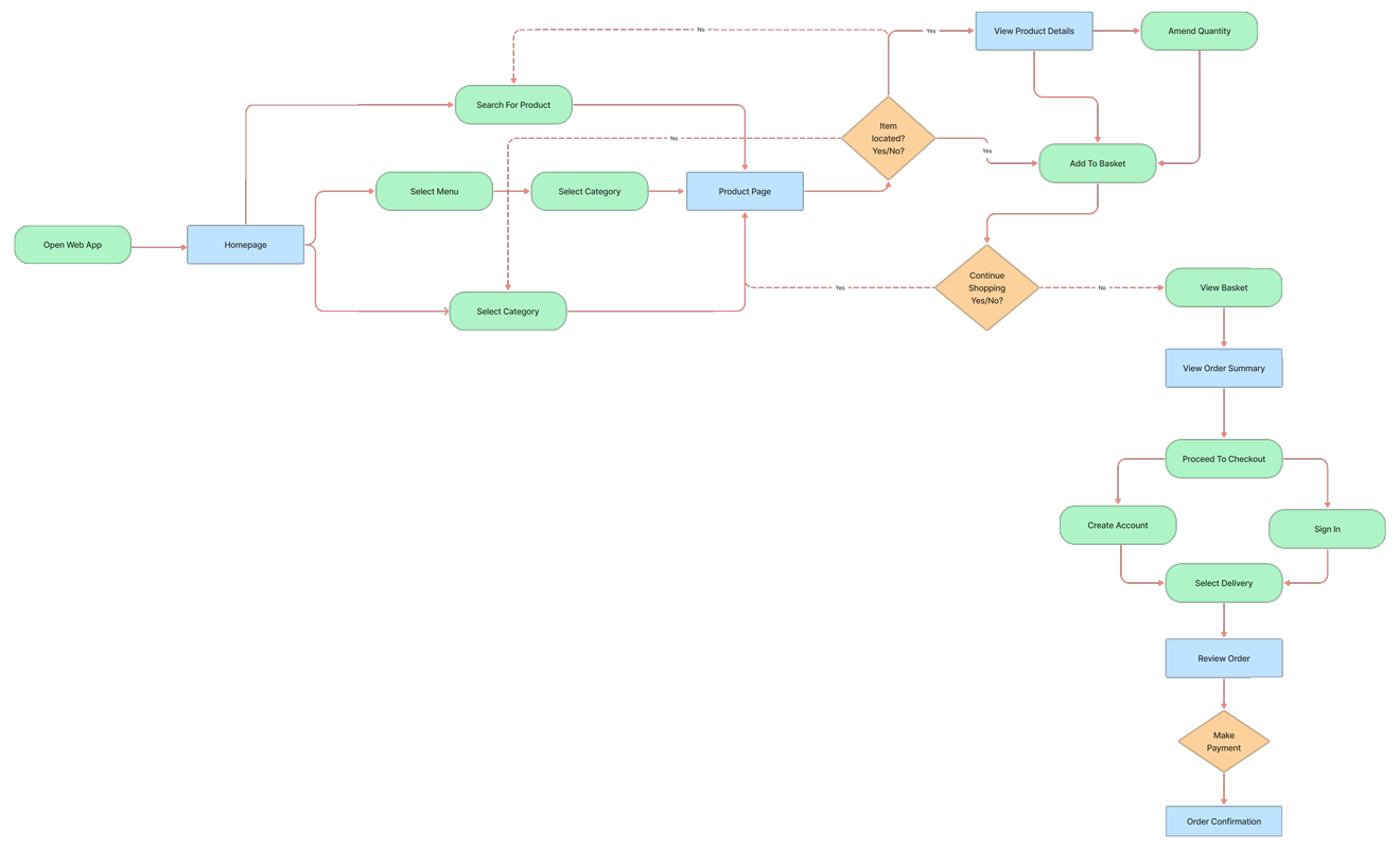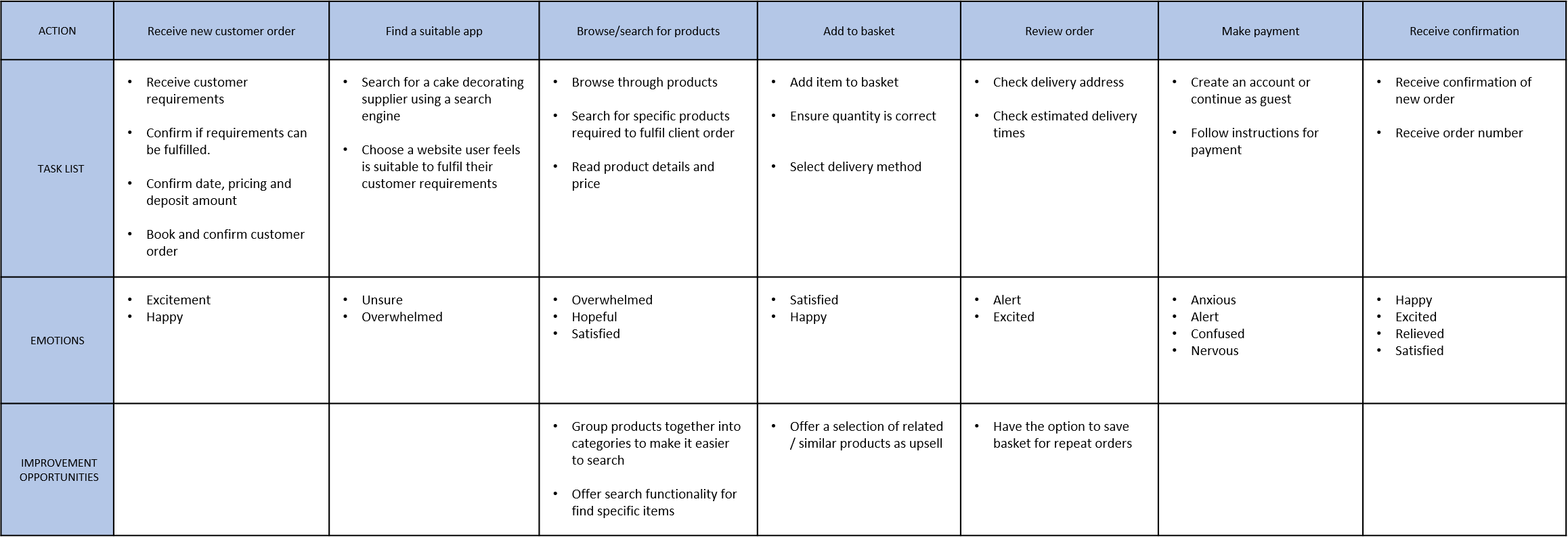 A user journey map was created to help visualise the process our user takes to successfully place an order on the Baking Stash web app. This allowed us to understand each action taken, as well as identifying opportunities for improvements.